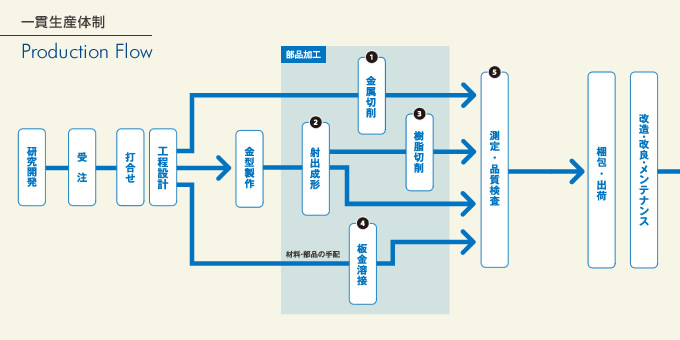 今日では、難削材の超精密機械加工から金型製作から手掛ける樹脂の射出成形、スーパーエンプラ等における切削加工、複合機やレーザー加工機による板金溶接加工までの一貫生産体制を確立。高品質かつスピーディに対応しています。
